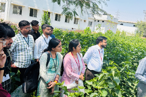On 22nd March 2025, the Department of Agriculture at Medicaps University organized a field exposure visit for its students. A group of 30 students gained valuable insights into Mulberry Silk Cocoon Production through the scientific and systematic rearing of mulberry silkworms. In addition to this, they also acquired extensive knowledge about the nursery development and block plantation of mulberry host plants, including techniques for their successful maintenance. During the visit, the students had the opportunity to interact with Shri Kailash Patidar, Junior Sericulture Officer at the Research Centre, Government of Madhya Pradesh. He conducted an insightful lecture-cum-practical demonstration on pre-cocoon sericulture activities, highlighting effective methods to ensure a substantial increase in raw silk production across Madhya Pradesh.