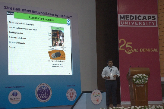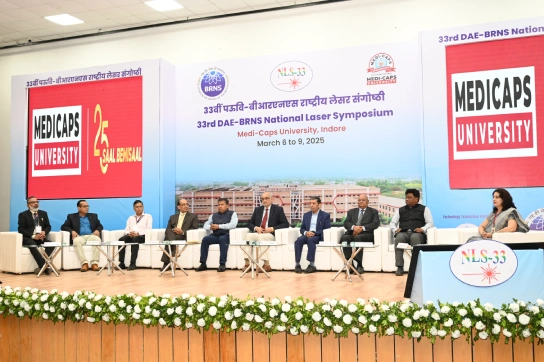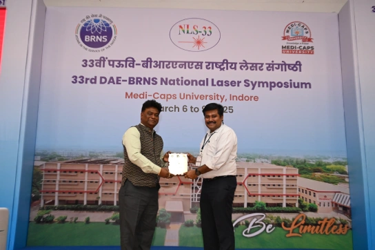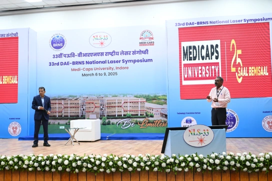 National Laser Symposium (NLS-33) at Medicaps University Indore Medicaps University witnessed a convergence of brilliant minds in the prestigious 33rd DAE-BRNS National Laser Symposium from March 6-9, 2025 in association with Raja Ramanna Centre for Advanced Technology (RRCAT), Indore. The university hosted this prominent event, organized by Department of Atomic Energy & Board of Research in Nuclear Science. The symposium was graced by Hon’ble Chancellor of Medicaps University, Shri R. C. Mittal, Vice-Chancellor Dr. Dilip K. Patnaik, Indian Laser Association President Prof. S.K. Majumdar, Secretary Dr. C.P. Paul, Prof (Dr.) A. A. Koser, Convener, Dr. Preeti Jain, along with other senior scientists, professors from RRCAT, Mr Palash Garg OSD to Chancellor, Ms Saloni Garg, Director Branding and Promotion, all heads and Deans of MU, and participants from various organizations. It was a proud moment for Indore and especially for Medicaps University on being able to celebrate such an occasion in its campus. Around 400 participants from across the country. The event features 22 expert talks from eminent researchers and 226 research paper presentations, fostering academic discourse and innovation. Amongst those 17 poster presentation, 5 consolation, and 3 Theses presentation awards were presented by Indian Laser Association. An enlightening session was delivered by Prof Jaipal Mittal, BARC, Mumbai on Breaking Bonds on Order- A Dream Still Alive.