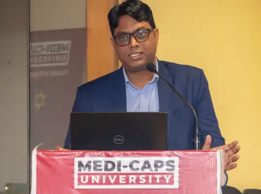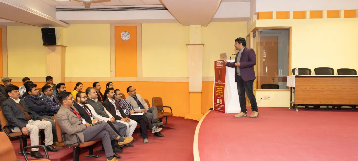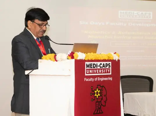 A six-day ATAL Faculty Development Program (FDP) on ‘Robotics and Automation in Advanced Manufacturing and Industry 4.0’ was inaugurated by Prof. I. A. Palani, Dean of Research and Development at IIT Indore. The event was graced by Hon’ble Prof. D. K. Patnaik, Vice-Chancellor of Medi-Caps University; Prof. D. K. Panda, Pro-Vice Chancellor; Prof. Pramod S. Nair, Dean of Engineering; and Prof. R. K. Shukla, Head of the Mechanical Engineering Department. During his inaugural address, Prof. Palani highlighted the growing indispensability of automation in modern civilization, emphasizing its widespread adoption as a necessity for progress. Prof. Patnaik, in his insightful speech, underscored the importance of balancing technological advancements with fundamental human needs and advocated for the integration of technology without compromising societal values. Prof. Panda spoke about the critical need for utilizing technology responsibly and ensuring its safe application for the betterment of humanity. Prof. Nair provided an in-depth overview of the rapid advancements in robotics and automation. He shared statistics to emphasize the importance of staying aligned with these technological trends to remain competitive.
