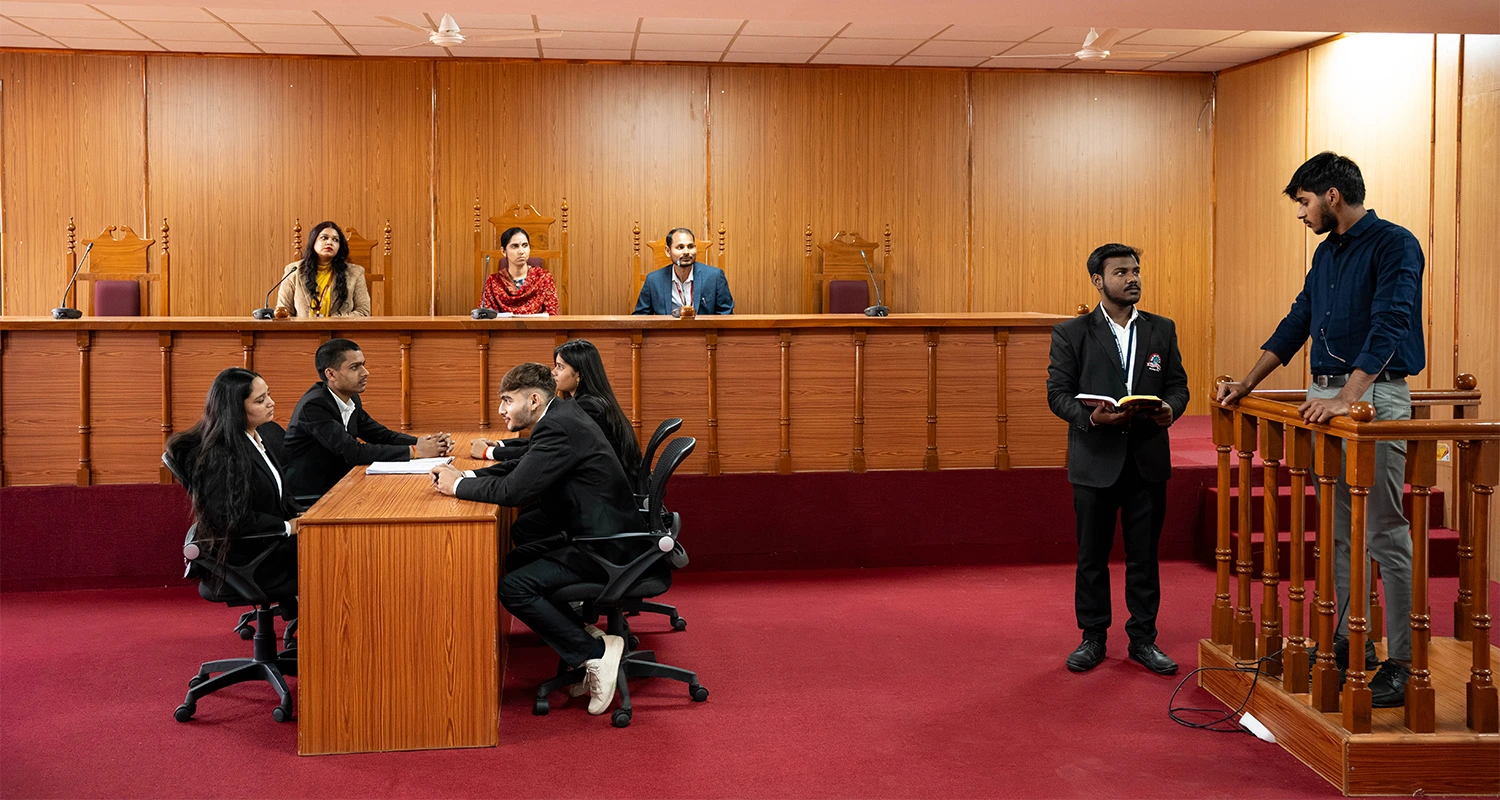 Moot Court room basically recreates the court atmosphere enabling students to take part in stimulated court proceedings that involves everything from drafting briefs to participating in oral arguments.
